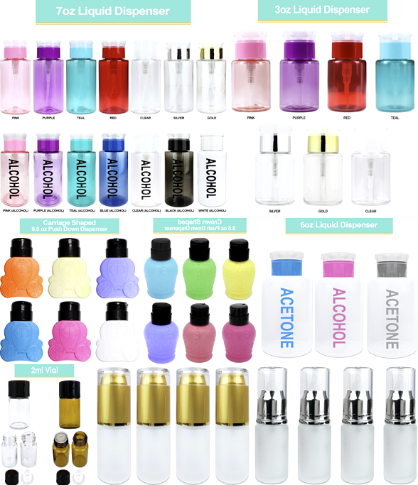 - Dispensers are essential items that help safely store and organize sanitation products, ensuring clean and hygienic nail and beauty care. These containers are ideal for holding liquids such as alcohol, disinfectants, nail prep solutions, and more, providing easy access while minimizing spills and contamination. Made from durable, high-quality materials, these dispensers are designed for both professional and at-home use, promoting a hygienic, clean environment and helping to maintain safety and cleanliness. Their practical design makes them easy to refill, transport, and seamlessly incorporate into any activity, whether for travel, work, or home use. (For acetone, only containers marked “Acetone” are suitable as they are specifically designed to handle this solvent. Do NOT use any other container. Always use bottles labeled “Acetone”.)